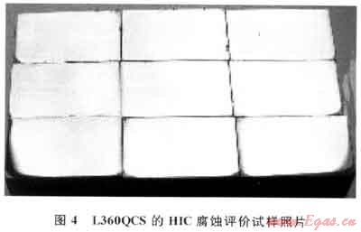 從HIC試件腐蝕后的宏觀照片可以看出,試樣表面有個別氫鼓泡出現(xiàn),腐蝕產(chǎn)物層較薄,按照標(biāo)準(zhǔn)切割方法用線切割手段切開試樣,經(jīng)打磨、拋光,觀察斷面氫致開裂裂紋形貌,對處理后的試樣進(jìn)行觀察,沒有發(fā)現(xiàn)HIC裂紋。裂紋敏感率、裂紋長度比值、裂紋厚度率、任一裂紋的最大長度4項指標(biāo)均達(dá)到耐HIC標(biāo)準(zhǔn)。圖4為模擬高含硫工況條件下L360QCS的HIC試樣照片。