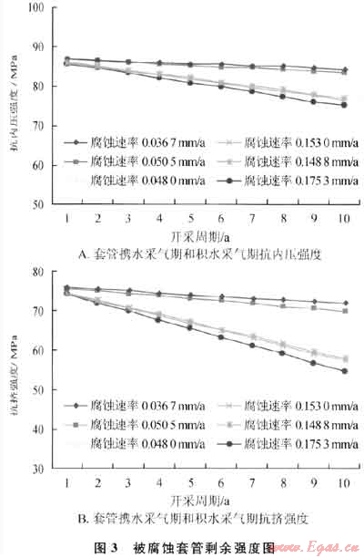由圖3可知,隨套管使用年限的增加,套管抗內壓強度和抗擠強度呈直線下降且腐蝕速率越大套管的剩余強度降低得越快,套管在積水采氣期腐蝕較嚴重。