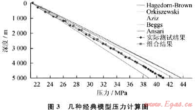 (2) 根據(jù)其生產(chǎn)數(shù)據(jù):油、水、氣產(chǎn)量(qo、qw、qg)和相對(duì)密度(γo、γw、γg)及井口壓力(pwn)、溫度(Twh),分別用不同的兩相管流模型計(jì)算并繪出壓力分布曲線。