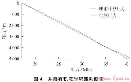 依照該模型,可進(jìn)行該井的壓力計(jì)算和積液判斷。7月1日該井井口實(shí)測(cè)數(shù)據(jù):產(chǎn)油量35.90m3/d,產(chǎn)水量16.63m3/d,產(chǎn)氣量2.83×104m3/d,井底溫度137.27℃,井口壓力17.20MPa,其計(jì)算結(jié)果如圖4所示。由圖4可知:計(jì)算壓力曲線與實(shí)測(cè)曲線在井底出現(xiàn)了較大偏差,故判斷井底有積液,由公式(4)計(jì)算得積液深度為4774.68m。
