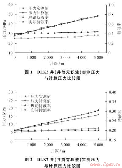 利用式(3)選定的模型,筆者在對(duì)該區(qū)塊大量井井筒壓力分析計(jì)算時(shí)發(fā)現(xiàn):①井筒不積液時(shí),計(jì)算壓力分布曲線與實(shí)測(cè)壓力分布曲線吻合較好(圖1),其實(shí)際持液率小于理論持液率[2],井筒無積液。大澇壩多口井計(jì)算表明,當(dāng)井筒無積液時(shí),其優(yōu)選模型的計(jì)算壓力與實(shí)測(cè)壓力的平均誤差2%。②當(dāng)井筒有積液時(shí),計(jì)算壓力低于實(shí)測(cè)壓力且誤差較大(圖2),其實(shí)際持液率小于理論持液率,井筒有積液。