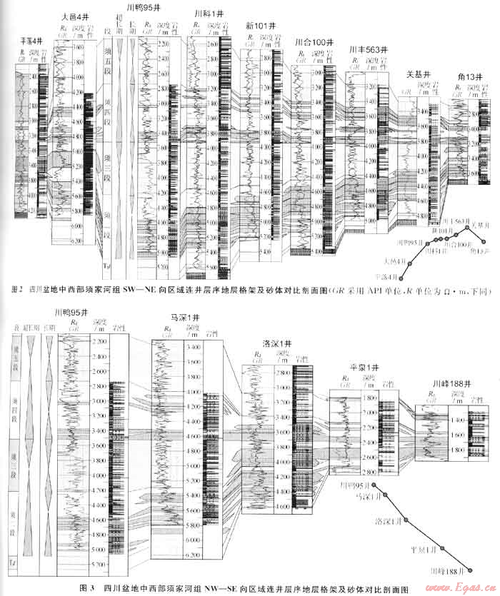 基準(zhǔn)面上升旋回內(nèi)巖相存在明顯差異,即等時(shí)異相,川西坳陷中段成都凹陷NW-SE向諸多三維地震剖面這一特征非常典型,受篇幅所限,此不贅述。