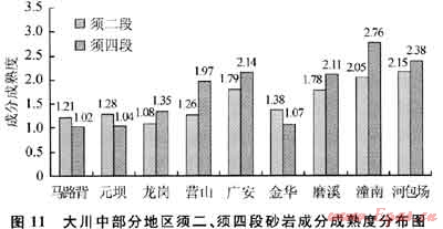 川中地區(qū)須家河組各砂層段厚度基本一致,砂巖百分比較高,一般介于70%~90%。經(jīng)巖礦鑒定,黏土雜基含量一般低于5%,淘洗干凈。除正粒序構(gòu)造砂層上部和逆粒序砂層底部可以有厚度不大的粉細(xì)粒巖屑砂巖外,主要為中粒、中粗粒巖屑石英砂巖或長(zhǎng)石巖屑砂巖。巖屑多為硅質(zhì)巖屑、石英巖巖屑及花崗巖巖屑等硬質(zhì)巖屑,成分成熟度介于1.02~2.76(圖11)。在營(yíng)山以北、河包場(chǎng)以東區(qū)域須四、須六段軟質(zhì)巖屑明顯增加、雜基含量增多,須二段除川北元壩、九龍山地區(qū)部分層段雜基含量較高及碳酸鹽巖巖屑增多外,普遍淘洗干凈,且在九龍山、元壩、馬路背及金華地區(qū)須二段“腰帶子”泥巖之下局部可見石英砂巖,表明須二段湖盆范圍較須四、須六段的范圍大,且局部有海侵影響。