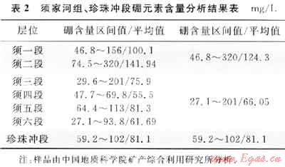Couch[13]認(rèn)為,沉積物中的硼(B)含量多少與水體鹽度有關(guān),即水體鹽度越高,硼含量就越大,沉積物吸附的硼離子就越多,故硼可以作為指示古水體鹽度的主要標(biāo)志。據(jù)Walker等(1963)研究認(rèn)為黏土礦物中硼含量大于120mg/L為咸水;80~120mg/L為半咸水;小于80mg/L的為淡水。筆者近期對(duì)大川中及九龍山地區(qū)須家河組、侏羅系珍珠沖段地層采樣進(jìn)行了微量元素分析,結(jié)果如表2所示。