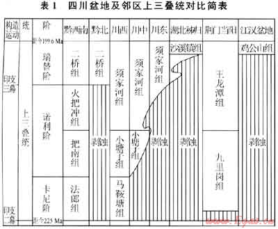 發(fā)生在三疊紀(jì)中晚期的印支二幕運(yùn)動(dòng),結(jié)束了揚(yáng)子地臺(tái)漫長(zhǎng)的海相沉積歷史,在上揚(yáng)子地區(qū)的晚三疊世形成了從殘留海相地層到陸相地層的地層沉積序列。以現(xiàn)今的四川盆地為代表,晚三疊世地層為一套西厚東薄、北薄的楔狀體。川西地區(qū)上三疊統(tǒng)包括海相-海陸過渡相的馬鞍塘組(垮洪洞組)、小塘子組(現(xiàn)已合稱為須一段)及須家河組(對(duì)應(yīng)須二段及其以上地層),地層厚逾4000m。川中地區(qū)上=疊統(tǒng)厚500~600m。新近完鉆的立18井須一段巖心中見石英砂巖,并在頁(yè)巖中發(fā)現(xiàn)海相雙殼類化石,更證實(shí)了須瀝積期的殘余海灣已延伸至川中地區(qū)。經(jīng)川東到鄂西醛秭歸上三疊統(tǒng)變薄相變?yōu)楹穸葍H數(shù)十米的“沙溪鎮(zhèn)”組粗碎屑沉積。經(jīng)川南到貴州西部、北部大部分地區(qū)也變薄相變?yōu)閿?shù)十米至不足200m厚的“二橋組”粗碎屑河流相砂巖沉積(表1)。