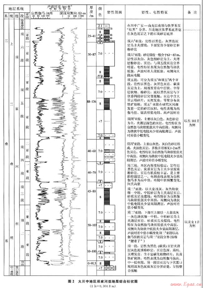 本文所指的四川盆地大川中地區(qū)地理位置北至營(yíng)山-鹽亭一線,西達(dá)威遠(yuǎn)-八角場(chǎng),南抵大足-威遠(yuǎn),東接華鎣山,面積達(dá)4×104km2(圖1)。該研究區(qū)是近年來四川盆地天然氣勘探開發(fā)的重要區(qū)域之一。大川中地區(qū)上三疊統(tǒng)須家河組地層縱向上可劃分為須一段-須六段6個(gè)巖性段,其中須一、須三、須五段巖性以泥頁(yè)巖夾煤層為主,須二、須四、須六段則為砂巖夾泥頁(yè)巖(煤)。侏羅系底界劃分意見:在川中南部地區(qū)以“紅黑”原則將侏羅系底界劃在紅色泥巖之下出現(xiàn)的砂巖底界;而川北地區(qū)如龍崗、八角場(chǎng)地區(qū)則劃在灰色泥巖之下的石英砂巖底界。其中須二、須四段基本上以其中部的泥巖段(須二段中部泥巖段,現(xiàn)場(chǎng)稱為“腰帶子”)又劃分為2個(gè)亞段,須六段也按巖性劃分出2個(gè)亞段(圖2)。
