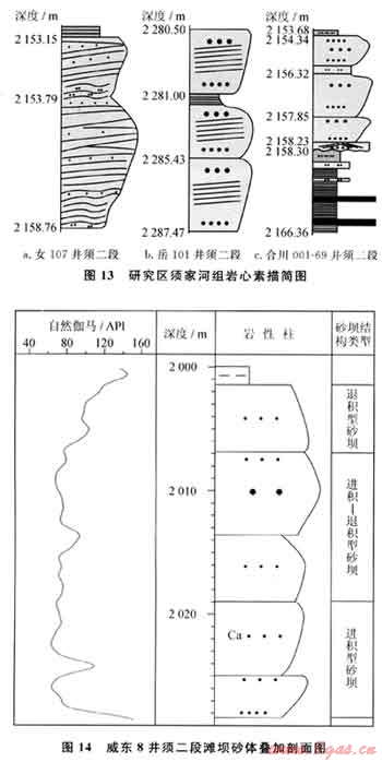 具正粒序的砂體,自然伽馬測(cè)井曲線常呈鐘形,往往被解釋為河流砂體,這是導(dǎo)致須家河組解釋為三角洲相的一個(gè)基本因素。經(jīng)巖心觀察及微觀研究,具鐘形形態(tài)的砂體除河流體外,另外是風(fēng)暴巖砂體和退積式砂壩(可能類似于羅啟后教授稱的水進(jìn)河床砂)。退積式砂壩系指當(dāng)湖平面上升速度大于灘壩砂體加積速度時(shí),灘壩砂體退積式沉積,其上部最終演化成湖盆細(xì)粒沉積物的粉砂坪或泥坪,亦可稱之為等效湖進(jìn)灘壩。與這種退積式灘壩伴生的下部地層多為進(jìn)積式的灘壩疊加體,而向上為較深水的泥巖(圖14)。
