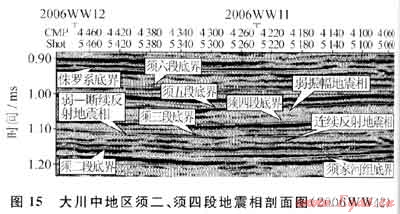 經(jīng)地震資料分析,大川中地區(qū)須家河組沉積地形相對(duì)平緩,再加上湖流、湖浪對(duì)早期沉積的三角洲相深度改造,須二、須四段不發(fā)育諸如前積、河道充填等地震相類型,而發(fā)育弱振幅地震相、斷續(xù)(弱一斷續(xù))反射地震相和連續(xù)反射地震相(圖15)。