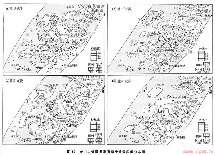 須二段在川中北部地區(qū)表現(xiàn)為辮狀河-辮狀三角洲平原沉積相。在元壩-龍崗一線以南區(qū)域進(jìn)入湖盆,形成濱淺湖灘壩沉積相(圖17-a、b)。須四、須六段沉積期,川東北地區(qū)白大巴山前緣的濕地扇、辮狀河、辮狀三角洲在龍崗、營(yíng)山地區(qū)進(jìn)入湖盆,形成濱淺湖砂體沉積相(圖17-c、d)。