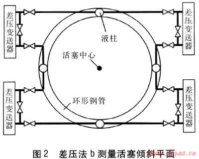 差壓法a測量活塞傾斜平面見圖1。在活塞上采用鋼管做兩個大的水平尺,互相垂直異面交叉,不連通,交叉點為活塞的中心位置。鋼管內(nèi)充有低揮發(fā)性的專用油品,每根鋼管兩端各有一個立管,管內(nèi)充有一定高度的液注,同一根鋼管的兩個立管下部分別與差壓變送器的正負壓室相連,根據(jù)液柱高差,可計算得出該方向傾斜量的大小。差壓變送器鄰近測壓點安裝。