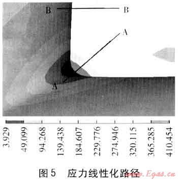 通過(guò)分析結(jié)果云圖可以查看管件應(yīng)力的分布情況。本例模型應(yīng)力最大點(diǎn)位于管件焊縫體內(nèi)側(cè),在最高工作壓力為4.0MPa時(shí)材料最大主應(yīng)力為410.454MPa。最大應(yīng)力點(diǎn)位于焊縫體內(nèi)側(cè)的圓角過(guò)渡處,該區(qū)域?yàn)檎麄€(gè)模型受力最集中的區(qū)域且其他區(qū)域的應(yīng)力均遠(yuǎn)遠(yuǎn)小于該區(qū)域,故僅對(duì)該區(qū)域進(jìn)行應(yīng)力評(píng)定和疲勞評(píng)定即可確定模型工作條件下的安全性。
