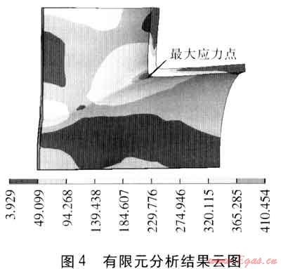 進(jìn)行求解并查看求解結(jié)果過(guò)程,分別計(jì)算出內(nèi)壓為0.4MPa和4.0MPa時(shí)材料的最大主應(yīng)力為41.045MPa和410.454MPa。