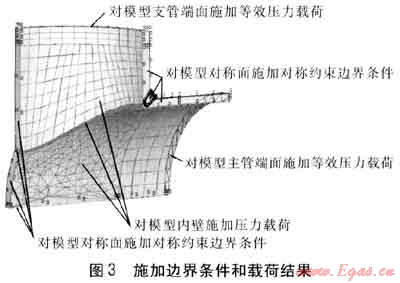 完成后通過(guò)ANSYS程序,分別對(duì)模型支管和主管端面施加等效壓力19.05MPa和23.04MPa,對(duì)模型內(nèi)壁施加工作條件下的載荷:壓力為4.0MPa。施加邊界條件和載荷結(jié)果見(jiàn)圖3。