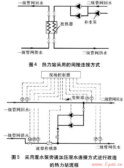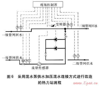 恒源熱力公司自2009年8月開始,對東北線熱網進行混水連接、遠程監(jiān)控技術改造。已將49座熱力站進行整合改造成混水連接熱力站30座,建設監(jiān)控中心,對熱力首站和熱力站實施監(jiān)控。改造項目包括將原有熱力站水-水換熱器、補水泵等設備拆除,進行站內管道的改造,安裝自動調節(jié)閥、現場控制器。2009年11月10日,所有改造工作全部完成,至11月30日全部調試完畢,正式投入運行。改造主要考慮采用混水泵旁通加壓、混水泵供水加壓兩種連接方式。