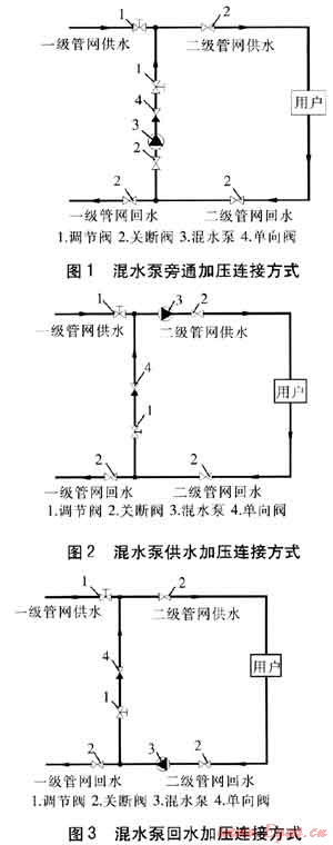 混水連接方式可分為混水泵旁通加壓、混水泵供水加壓、混水泵回水加壓連接方式[4],這3種連接方式分別見圖1~3。通過改變混水比調整二級管網供水溫度,從而改變一級管網回水溫度,滿足熱力首站二級側回水溫度的要求。