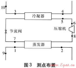 為了研究空調(diào)系統(tǒng)運行參數(shù)與故障之間的關(guān)系,挑選出對故障敏感的運行參數(shù),測點的選擇應基于整個空調(diào)系統(tǒng),包括冷卻水側(cè)、冷水側(cè)及制冷劑側(cè)。由上述理論分析可知,冷水機組冷凝器水側(cè)受阻將引起蒸發(fā)溫度、冷凝溫度、壓縮機吸氣溫度、壓縮機排氣溫度、冷水供回水溫度、冷卻水進出水溫度發(fā)生變化,因此應對這些參數(shù)進行測量。測點的布置見圖3,測量的參數(shù)名稱、測點位置及測量方式見表2。
