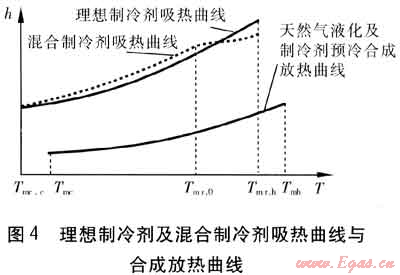 制冷劑在2.5~3.0MPa壓力(本文中壓力均為絕對(duì)壓力)及預(yù)冷終溫條件下已處于液態(tài),經(jīng)節(jié)流其壓力降至0.35~0.40MPa后,應(yīng)處于氣、液兩相狀態(tài),故制冷劑吸熱曲線斜率在冷箱的冷端大于合成放熱曲線在冷端的曲線斜率,理想制冷劑及混合制冷劑吸熱曲線與合成放熱曲線見(jiàn)圖4。
