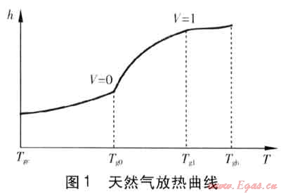 天然氣液化放熱的溫度-比焓(即T-h)曲線由3段平滑曲線組成,分割放熱曲線的點(diǎn)的相應(yīng)溫度是露點(diǎn)Tg1(氣化率V=1)及泡點(diǎn)Tg0(此時(shí)氣化率V=0),此2點(diǎn)也是曲線的2個(gè)拐點(diǎn)。天然氣放熱曲線見(jiàn)圖1。