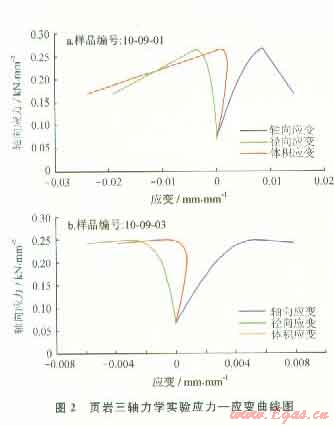 實驗利用MTS815型巖石力學(xué)試驗儀,選取M組不含天然層理面、天然裂縫的基質(zhì)巖心,采取垂直或平行層理面2種方式取樣。巖樣加工成直徑為2.54cm,長度為5.50 cm的柱狀巖心,端面磨平,模擬儲層溫度、壓力條件,進(jìn)行三軸、單軸力學(xué)實驗;巖樣加工成直徑為3.80 cm,長度為l.O0 cm的柱狀巖心,端面磨平,進(jìn)行巴西力學(xué)實驗。