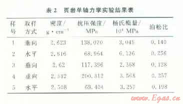 實驗結(jié)果表明,水平方向取樣的巖樣平均楊氏模量為4.70×104 MPa,抗壓強(qiáng)度為69.18 MPa,平均泊松比為0.227;垂直方向取樣的巖樣平均楊氏模量為2.99×104MPa,抗壓強(qiáng)度為l51.92 MPa,平均泊松比為0.175(表2)。