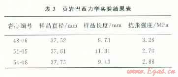 選取頁巖基質(zhì)巖石樣品,通過實驗測量,頁巖樣品抗張強(qiáng)度介于2~4 MPa,平均為2.94 MPa(表3)。