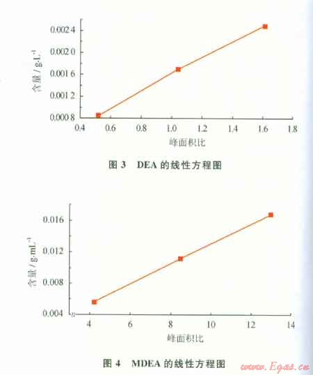 1)加入準(zhǔn)確定量的TEG為參比物,配制一系列標(biāo)準(zhǔn)樣品。以DEA、MDEA色譜峰面積與TEG色譜峰面積的比值為橫坐標(biāo),以標(biāo)準(zhǔn)樣品的濃度為縱坐標(biāo)作圖,得到線性方程。