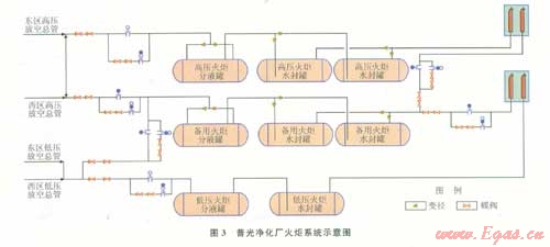放空管網(wǎng)系統(tǒng)包括從各系列天然氣凈化裝置內(nèi)的放空閥后至高低壓放空分液罐的部分。每系列裝置管廊上的高低壓放空總管經(jīng)位于裝置界區(qū)的高低壓分液罐分離泄放氣中攜帶的脫硫、脫水溶劑后,匯入東西區(qū)高低壓放空管網(wǎng)。東區(qū)高低壓放空管網(wǎng)主要負(fù)責(zé)第一、二、三聯(lián)合天然氣凈化裝置、趙家壩污水站及集氣總站的放空需要,西區(qū)高低壓火炬放空管網(wǎng)主要負(fù)責(zé)第四、五、六聯(lián)合天然氣凈化裝置的放空需要。東西區(qū)高壓放空管網(wǎng)并行進(jìn)入高壓放空分液系統(tǒng),東西區(qū)低壓放空管網(wǎng)匯合成低壓放空總管后進(jìn)入低壓放空分液系統(tǒng)。