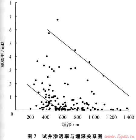 超低滲透儲(chǔ)層(滲透率小于0.1mD)占26.0%,低滲透儲(chǔ)層(滲透率介于0.1~1.0mD)占36.8%,中滲透儲(chǔ)層(滲透率介于1.0~5.0mD)占18.1%,高滲透儲(chǔ)層(滲透率大于5.0mD)占19.1%(圖6、表3)。試井滲透率總體隨埋深的增加而減少(圖7)。