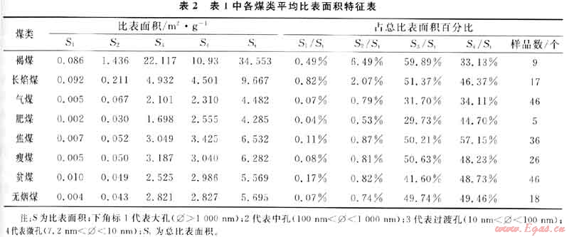 1) 華北地區(qū)褐煤、長(zhǎng)焰煤各孔徑結(jié)構(gòu)中比孔容分布較均勻,其他煤類中大孔、過(guò)渡孔占較高比例,中孔不發(fā)育;各煤類各孔徑結(jié)構(gòu)中比表面積微孔、過(guò)渡孔占絕對(duì)多數(shù)。