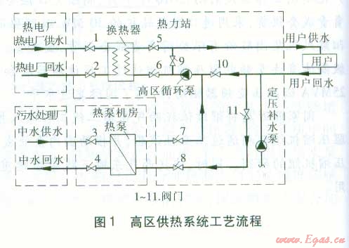 污水處理廠內(nèi)建有中水泵站l座,安裝3臺流量為625 m3h、揚(yáng)程為40 m的循環(huán)泵,流量滿足熱泵需求,中水循環(huán)泵采用變頻調(diào)速(由供回水壓差控制)。將中水作為熱泵的低溫?zé)嵩?,在小區(qū)內(nèi)建造熱泵機(jī)房1座。將熱泵作為基本熱源,承擔(dān)設(shè)計(jì)負(fù)荷的75%左右。熱電廠作為峰荷熱源,并在嚴(yán)寒期單獨(dú)運(yùn)行。小區(qū)內(nèi)建熱力站4座,由于l8層建筑比較分散,因此在1~3號熱力站內(nèi)分別設(shè)置l套高區(qū)系統(tǒng)和l套低區(qū)系統(tǒng),4號熱力站只設(shè)置l套低區(qū)系統(tǒng)。高區(qū)、低區(qū)供熱系統(tǒng)的工藝流程分別見圖1、2。