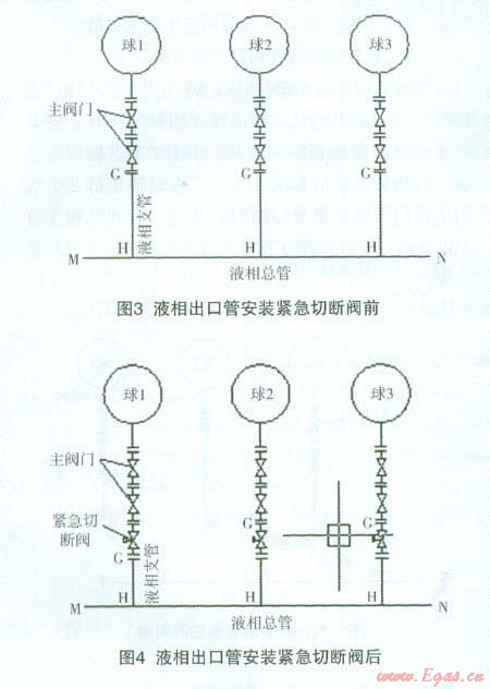 根據(jù)《氣瓶安全監(jiān)察規(guī)定》:《氣瓶充裝許可證》的有效期為4年;有效期滿前,氣瓶充裝單位應(yīng)當(dāng)向原審批部門申請更換《氣瓶充裝許可證》。我公司的液化石油氣儲灌站于2011年7月向河北省質(zhì)監(jiān)局提出《氣瓶充裝許可證》的換證申請;河北省特種設(shè)備學(xué)會于2011年11月對液化石油氣儲灌站進行了現(xiàn)場評審。評審專家根據(jù)新版《城鎮(zhèn)燃氣設(shè)計規(guī)范》中關(guān)于對“液化石油氣儲罐上安全閥件的配置”,要求我液化石油氣儲灌站3座400m,的液化石油氣球罐的氣相管和液相出口管上的根部主閥門下加裝緊急切斷閥。