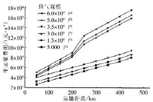 ②年運輸費用隨運輸距離線性變化,當供氣規(guī)模在3×1O4戶以下時,斜率較小;當供氣規(guī)模在3.5×104戶以上時,斜率較大,且在200 km和250km之間有一轉折。斜率差異主要是因為目前LNG汽車槽車型號少(國內(nèi)常用的LNG槽車容積主要為30 m3、40m3和45 m3),3×104戶以下供氣規(guī)模的氣化站每天所需的用氣量,單輛槽車每天運輸一次即能滿足。供氣規(guī)模超過3×104戶后,單輛槽車每天運輸2次或2輛槽車每天各運輸一次才能滿足氣化站每天所需的用氣量。出現(xiàn)轉折主要是因為建模過程中考慮到運輸安全性,規(guī)定槽車的行駛速度為70 km/h且單輛槽車每天在路上行駛的時間不超過13 h,因此當運輸距離超過200km后,氣化站每天所需的用氣量由原先的單輛槽車每天運輸2次來滿足變?yōu)?輛槽車每天各運一次來滿足,從而年運輸費用中的槽車年折舊費用、保險費用等增加。