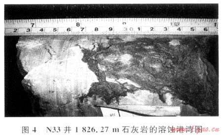 碳酸鹽巖是一種化學(xué)性較活潑的巖石,具有可溶蝕性,而且基本上貫穿其成巖作用的各個階段,只是溶蝕強度有明顯差異。該成巖作用常常導(dǎo)致孔、洞的大量發(fā)育,對改善儲層的儲集性能具有非常積極的意義。如南33井1826.27m奧陶系下馬家溝組巖心表面見有方解石充填物的溶蝕孔洞,洞徑約3×6mm,肉紅色石灰?guī)r邊緣還見溶蝕形成的港灣狀(見圖4)。