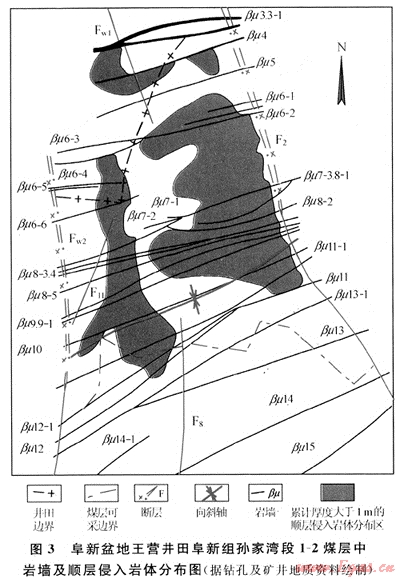王營井田喜山期基性侵入巖十分發(fā)育,主要巖石種屬為輝長玢巖、微晶輝長巖和輝綠巖[5]來計算[6],天然焦化增加的甲烷氣體仍有1.62Gm3[7]。。自北向南發(fā)育有βμ3、βμ3-1、βμ4、βμ5、βμ6-1、βμ6-2、βμ6-3、βμ6-4、βμ6-5、βμ6-6、βμ7-1、βμ7-2、βμ7-3、βμ8-1、βμ8-2、βμ8-3、βμ8-4、βμ8-5、βμ9、βμ9-1、βμ10、βμ11-1、βμ11、βμ12-1、βμ12、βμ13-1、βμ13、βμ14-1、βμ14、βμ15、βμ16共31條巖墻,并發(fā)育巖床等順層侵入體(圖3)。其中,巖墻走向近東西,傾向北北西或南南東,傾角為60°~89°。由于巖漿侵入造成煤的接觸變質(zhì)作用,使鄰近巖墻、巖床的煤層變質(zhì)程度增高,使該井田的天然焦儲量達32.07Mt。根據(jù)對王營井田長焰煤和天然焦中揮發(fā)分的測定和計算,從長焰煤生成1 t天然焦可同時生成甲烷氣體504m3,這樣,除長焰煤在正常的深成變質(zhì)作用形成甲烷外,還因巖漿侵入作用,伴隨長焰煤的天然焦化增加了16.2Gm3甲烷氣體,按10%的生成氣體保留在煤層