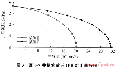 澀3-7井在2002年10月12日實(shí)施高壓一次充填作業(yè),并且分別在防砂前2002年8月1日和防砂后2002年11月1日進(jìn)行了產(chǎn)能試井,對試井資料使用一般單點(diǎn)法、指數(shù)式單點(diǎn)法和二次單點(diǎn)法進(jìn)行分析處理,得出措施前后的IPR對比曲線(圖3)。
