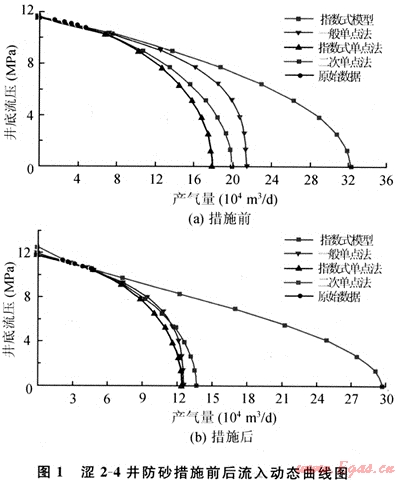 澀4-9井在2003年9月28日實(shí)施高壓一次充填作業(yè),并且分別在防砂前20Q3年8月12日和防砂后2003年11月24日進(jìn)行了產(chǎn)能試井,對試井資料使用一般單點(diǎn)法、指數(shù)式單點(diǎn)法和二次單點(diǎn)法進(jìn)行分析處理,得出措施前后的IPR對比曲線如圖2所示。