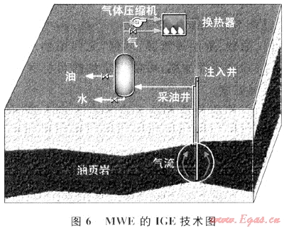 工藝流程:先將高溫蒸汽注入油頁(yè)巖地層中,對(duì)流加熱油頁(yè)巖,與油頁(yè)巖換熱后,把熱解生成的油氣載到地面上來(lái),冷凝、回收。分離后的不凝氣被加熱到一定溫度后通入到地層與油頁(yè)巖換熱,循環(huán)利用(圖6)。MWE公司稱(chēng),該工藝中1口井的覆蓋面積可達(dá)3000m2,產(chǎn)油超過(guò)8100t/a[12]。