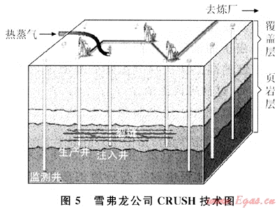 2006年,雪弗龍公司和Los Alamos國(guó)家實(shí)驗(yàn)室聯(lián)合開(kāi)發(fā)了CRUSH技術(shù),并將根據(jù)設(shè)計(jì)的含有2~5個(gè)四點(diǎn)井網(wǎng)單元的工業(yè)試驗(yàn)?zāi)P?,進(jìn)行實(shí)驗(yàn)室室內(nèi)實(shí)驗(yàn)和小規(guī)模的現(xiàn)場(chǎng)試驗(yàn)。目前主要研究注入高溫CO2加熱油頁(yè)巖層技術(shù)(圖5)。該技術(shù)首先對(duì)頁(yè)巖層進(jìn)行爆破壓裂,提高CO2與干酪根接觸的表面積,將CO2以對(duì)流的方式從豎直井導(dǎo)入,通過(guò)一系列水平裂縫加熱頁(yè)巖層。生成的烴氣經(jīng)垂直井采出。該技術(shù)是基于1950年代Sinclair油氣公司利用垂直井間自然和引導(dǎo)的裂縫開(kāi)采地下干酪根的試驗(yàn)開(kāi)發(fā)的[12]。康菲石油公司和阿克倫大學(xué)的研究表明:CO2是一種能使頁(yè)巖油很好回收的載體,并申請(qǐng)了專(zhuān)利[12]。該技術(shù)需要大量水,并進(jìn)行現(xiàn)場(chǎng)生產(chǎn),對(duì)環(huán)境破壞較大[13]。