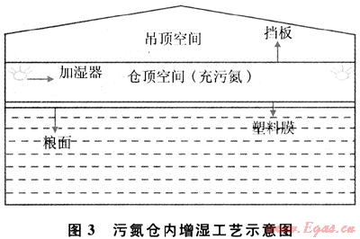目前,我國福建、廣東、上海、河北和江蘇等地的LNG接收站均規(guī)劃建設利用LNG冷能的空分裝置,其規(guī)模均在日產液體空分產品600t左右,空氣分離過程同時副產了大量的污氮。從空分裝置排出的污氮含氧量在5%以下,溫度為5~10℃,幾乎不含水。假定污氮溫度為10℃,熱容為1.035kJ/(kg℃),則100t/d的污氮從10℃升高至20℃時提供的顯冷約為12.0kW。同時污氮絕對干燥,通過加水增濕可將低濕度轉化為冷量,10℃絕對干燥的污氮氣體的焓值為10.1kJ/kg,當污氮變成20℃、相對濕度80%時的焓值為50.24kJ/kg,則100t/d的污氮可提供冷能約46.5kW。因此,10℃、100t/d的污氮可以提供58.5kw的冷能,其中顯冷僅占20.5%,而干度轉化成的冷能占79.5%。污氮用于低溫儲糧主要有兩種方式:①將污氮進行霧化增濕,溫度降低,低于10℃后通入糧倉進行穿透降溫,替代谷冷機;②根據倉儲經驗,大約有70%的熱量是通過倉房頂部傳入庫內的,所以可將污氮充入密閉的糧倉上層空間,然后在倉內進行霧化增濕降低污氮溫度,使倉溫保持在20℃以下,抵消掉從倉房頂部傳入的熱量,減緩平均糧溫的升高速度。其工藝流程如圖3所示。