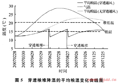 第二種方法是先將污氮采用噴霧加濕,溫度從10℃降至5.3℃,相對濕度增至29%,然后將此低溫污氮氣體進行糧堆穿透通風,平均糧溫變化曲線如圖5所示。由圖可知,無穿透降溫時倉內平均糧溫在8月份已經超過20℃的準低溫標準。為了實現(xiàn)低溫儲糧,當平均糧溫超過15℃時,采取污氮穿透糧堆的通風方式進行降溫,將糧食冷卻到12℃;隨著外界環(huán)境對糧溫的影響,冷卻后的糧溫會繼續(xù)升高,當平均糧溫升高到15℃時,繼續(xù)采用穿透糧堆通風的方式進行降溫,從而實現(xiàn)全年的低溫儲糧。