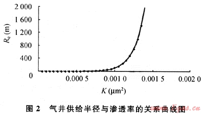 根據(jù)對(duì)不同滲流條件下的供給半徑定量研究表明(見圖2),滲透率小于1×10-3μm2的儲(chǔ)層,供給半徑在300m左右;當(dāng)滲透率大于1.2×10-3μm2時(shí)供給半徑就明顯增加。從圖2中看出:當(dāng)K介于1.2×10-3~1.4×110-3μm2,供給半徑為600~2000m;當(dāng)滲透率大于等于1.4×10-3μm2,供給半徑急劇增加,供給半徑在2000m以上。這說明氣藏的非均質(zhì)性對(duì)氣井供氣范圍影響大,井網(wǎng)密度應(yīng)不一樣。沙罐坪、云和寨北區(qū)、臥龍河石炭系氣藏大部分井滲透率小于1×10-3μm2,根據(jù)計(jì)算井距在300~2000km,從目前采出程度較高、非均質(zhì)性較強(qiáng)的福成寨、張家場(chǎng)石炭系來看,井距1~2km,從理論和實(shí)際開發(fā)效果對(duì)比認(rèn)為,沙罐坪、云和寨北區(qū)、臥龍河石炭系氣藏平均井距在1km左右為最好。