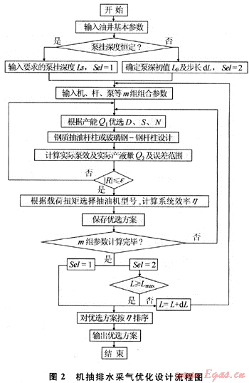 根據(jù)排水采氣井的地質(zhì)資料、生產(chǎn)數(shù)據(jù)、測井資料等數(shù)據(jù),在目前較為成熟的理論研究成果的基礎(chǔ)上,通過進(jìn)一步對機(jī)抽井的理論研究工作,研制出了“機(jī)抽排水采氣系統(tǒng)優(yōu)化設(shè)計(jì)軟件”。該軟件分為機(jī)抽井校核、機(jī)抽井設(shè)計(jì)、轉(zhuǎn)抽井設(shè)計(jì)、機(jī)抽井管理、機(jī)抽井診斷、實(shí)測系統(tǒng)效率計(jì)算、軟件幫助7大子系統(tǒng)[4~5]。應(yīng)用該軟件,在供排協(xié)調(diào)條件下對機(jī)一桿一泵系統(tǒng)進(jìn)行優(yōu)化設(shè)計(jì)與參數(shù)、設(shè)備等的優(yōu)選,其優(yōu)化設(shè)計(jì)流程如圖2所示。