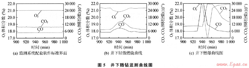 井下隨鉆監(jiān)測系統(tǒng)是專門為監(jiān)測井下燃爆現(xiàn)象而開發(fā)研制的。目前,在現(xiàn)場使用比較成熟的是西南石油大學(xué)研制的UBD氣體監(jiān)測系統(tǒng),其主要原理是在監(jiān)測到烴類氣體的情況下,通過對(duì)返出氣體中O2、CO2、和CO體積分?jǐn)?shù)變化的監(jiān)測來判斷井下是否發(fā)生燃爆。一旦發(fā)生井下燃爆,由于井下燃燒為不完全燃燒,返出氣體中的CO2、CO氣體體積分?jǐn)?shù)會(huì)升高,而O2氣體體積分?jǐn)?shù)會(huì)降低。圖5是3種情況下監(jiān)測界面圖的對(duì)比[2]。
