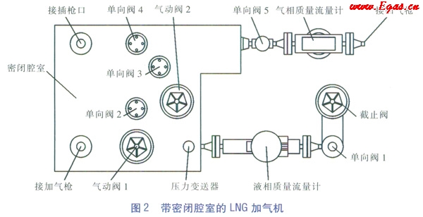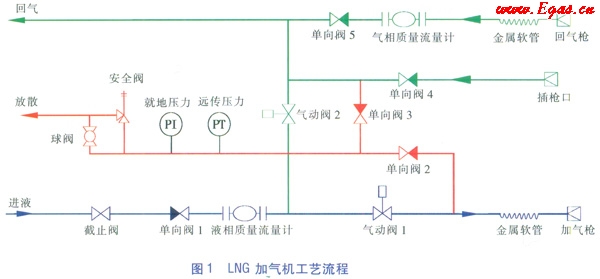 ③LNG加氣機加氣流程:LNG從加氣機進(jìn)液管道流向截止閥、單向閥1、液相質(zhì)量流量計、氣動閥1、金屬軟管、加氣槍,然后進(jìn)入車載氣瓶。