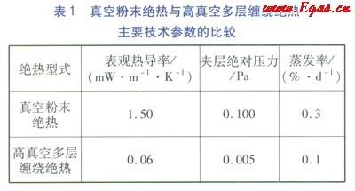 目前,在LNG加氣站的應(yīng)用中,LNG儲罐主要有真空粉末絕熱及高真空多層纏繞絕熱兩大類。真空粉末絕熱在絕熱空間充填多孔性絕熱材料(珍珠巖粉),對真空度的要求不高。與之相比,高真空多層纏繞絕熱由多層反射材料和間隔物交替纏繞而成,夾層抽成高真空,反射材料通常采用鋁箔或鍍鋁滌綸薄膜,間隔物一般采用玻璃纖維紙、植物纖維紙或尼龍網(wǎng)。由于高真空多層纏繞絕熱能有效地抑制熱輻射,因此,它具有優(yōu)良的絕熱性能。表1列出了在相同的邊界溫度條件下(300K)兩種絕熱型式的表觀熱導(dǎo)率和夾層真空度的對比,在環(huán)境溫度下兩種絕熱型式的LNG儲罐的蒸發(fā)率的對比??梢钥闯?,高真空多層纏繞絕熱結(jié)構(gòu)的絕熱性能要明顯優(yōu)于真空粉末絕熱。