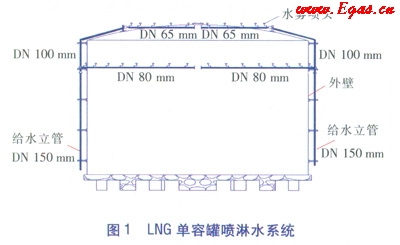在罐頂及罐壁周圍各設(shè)一圈供水管,均一分為二呈半環(huán)狀,罐頂供水環(huán)管為DN 65mm,罐壁供水環(huán)管為DN 80mm。兩個半環(huán)分別由兩條DN 150mm的給水立管供水(給水立管引自廠站內(nèi)的環(huán)狀消防管網(wǎng)),每條給水立管都由設(shè)在圍堰外閥門間內(nèi)的電動閥控制,當發(fā)生火災(zāi)時,可在控制室操作。該LNG單容罐的噴淋水系統(tǒng)見圖1。