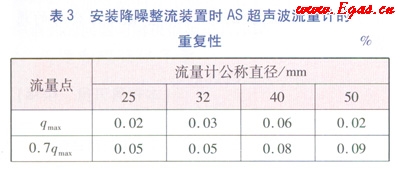 據(jù)國家質(zhì)量監(jiān)督檢驗檢疫總局發(fā)布的超聲波標準JJG 1030—2007《超聲流量計》的要求,的重復(fù)性不能超過相應(yīng)準確度等級規(guī)定的最相對誤差絕對值的1/5,即作為1.5級的AS流量計的重復(fù)性,除分界流量點(qt)以下的應(yīng)滿足重復(fù)性≤0.6%外,其他流量點應(yīng)滿足≤0.3%。流量計的重復(fù)性越小,性能越好。析表3和表4中的數(shù)據(jù),安裝降噪整流裝置的As超聲波流量計的重復(fù)性比不安裝降噪整流裝置的超聲波流量計的重復(fù)性要小很多,達到0.5級AS超聲波流量計的重復(fù)性的要求。試驗證明降噪整流裝置的整流效果在超聲波流量計的重復(fù)性方面也能體現(xiàn)。