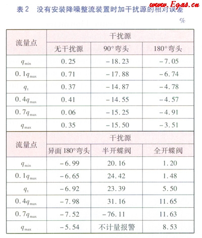為了使試驗結(jié)果更有對比性和說服力,對沒有安裝降噪整流裝置的AS超聲波流量計進行了相同的試驗。試驗完畢后對數(shù)據(jù)進行了統(tǒng)計,具體數(shù)據(jù)見表2。通過數(shù)據(jù)分析,沒有安裝降噪整流裝置的AS超聲波流量汁在以上5種干擾源的環(huán)境下測量出來的相對誤差偏離非常大,最大達到了-76.11%左右。因半開的蝶閥能使氣流的方向傾斜向管壁,對AS超聲波流量計的計量結(jié)果影響最為突出。在檢定qmax流量點時因受斜向氣流的干擾,AS超聲波流量計出現(xiàn)了不計量報警的異常狀態(tài)。在超聲波流量計的電子系統(tǒng)中,能有效剔除由混響、電磁干擾等引起的計量誤差的算法不能消除機械情況下的干擾引。由此說明降噪整流裝置在整流方面起著決定性的作用。