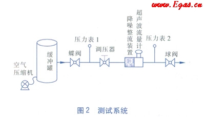 試驗中,用來產(chǎn)生超聲波噪聲的設(shè)備是調(diào)壓器。在氣體流動的過程中,調(diào)壓器兩側(cè)的壓力差越大所產(chǎn)生的超聲波噪聲越大。本測試的方法是:在一個容積為5m3的緩沖罐中充入空氣,使其內(nèi)部達到500kPa左右的絕對壓力,緩沖罐的一側(cè)接有DN 50mm的管道,管道上依次接有蝶閥、壓力表1、調(diào)壓器、降噪整流裝置、AS超聲波流量計、壓力表2和球閥。為了模擬實際使用現(xiàn)場,特約束了它們之間的距離。蝶閥與壓力表1相距10D(D為管道公稱直徑),壓力表1與調(diào)壓器相距15D,調(diào)壓器與降噪整流裝置相距5D,降噪整流裝置與AS超聲波流量計直接連接,超聲波流量計與壓力表2相距10D,壓力表2與球閥相距10D,測試系統(tǒng)見圖2。選用的AS超聲波流量計規(guī)格為DN 50mm,始動流量為0.37m3/h,流量范圍為3~150m3/h。