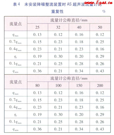 為了使得試驗結(jié)果更具有對比性,把各個口徑的AS超聲波流量計拆下降噪整流裝置后按照所校驗流量點進行檢定,并統(tǒng)計各個流量點的重復(fù)性,見表4。